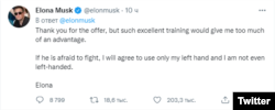 "Если он боится драться, я соглашусь использовать только левую руку - а я даже не левша", - написал Илон Маск.