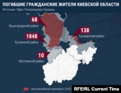 В свою очередь, Офис генпрокурора Украины в ответ на запрос "Настоящего Времени" подготовил общую статистику по всей Киевской области. С начала полномасштабной войны России против Украины украинские следователи нашли в Киевской области тела 2064 погибших гражданских жителей. Больше всего из них – в Бучанском районе, 1848 тел погибших. Только за преступления на территории Киевской области следователи открыли уголовные производства против 190 российских военных по статье "Нарушение законов и обычаев войны". 73 российских военных украинская сторона считает причастными к умышленным убийствам на территории Киевской области.