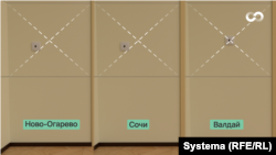 "Система" изучила сотни публикаций на сайте Кремля за последние десять лет и десятки часов передачи "Москва.Кремль.Путин", сопоставила фото и видео с документами госзакупок, планами зданий и командировками журналистов государственных СМИ. Выяснилось, что у Путина как минимум три почти абсолютно одинаковых кабинета в трех разных резиденциях, которые Кремль постоянно выдает за "кабинет в Ново-Огарёве".